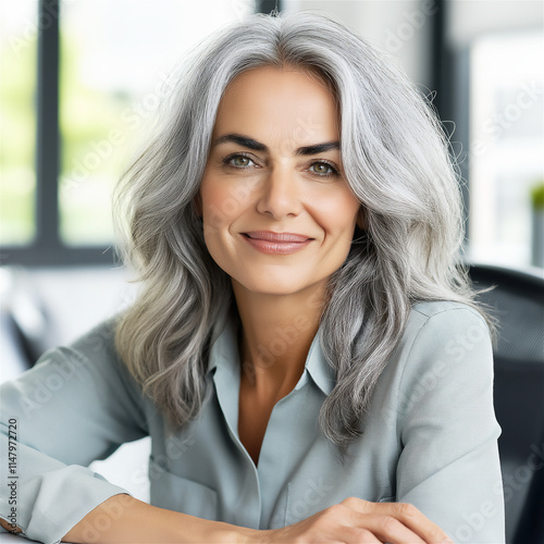 woman, middle-aged, grey hair, professional, smiling, confident, elegant, mature, charming, indoor, modern, friendly, relaxed, successful, business, corporate, executive, senior, person, adviser, adviser, approachable, career, leader, portrait, expertise, life events, refined, sophisticated, management, empowerment, inspiration, mentor, motivation, lifestyle, well-being, assurance, positivity, engaging, expression, personality, welcoming, support, communication, workplace, casual attire