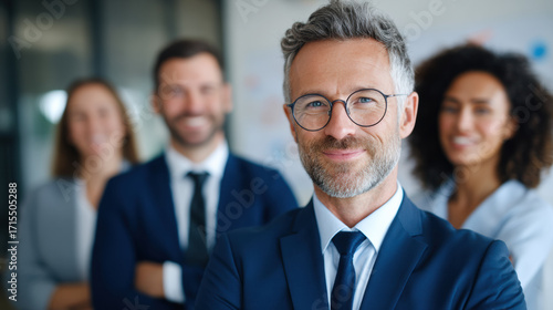 Confident professional business team in office with leader smiling and colleagues standing behind