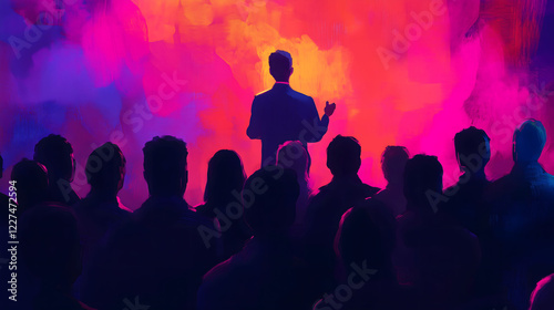 public, speaker, audience, event, engagement, confidence, presentation, oratory, communication, inspiration, vibrant, crowd, performance, gathering, speech, empowerment, leader, expression, atmosphere, connection, interaction, rally, night, glow, entertainment, motivation, host, seminar, conference, talk, workshop, charisma, theatre, stage, influence, vision, storytelling, energy, impact, dynamic, nirvana, teaching, guidance, celebration, surrounding, setting, artistry, generative, ai