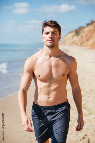 Confident shirtless young man walking along the beach