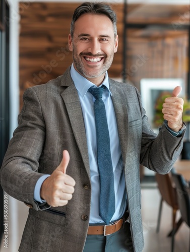 confident, smiling, businessman, showing, thumb up, gesture, business suit, office, man, male