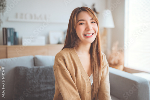 Confident smiling young adult asian woman looking at camera while sitting at home, Happy beautiful lady pretty face dental smile posing alone indoors.