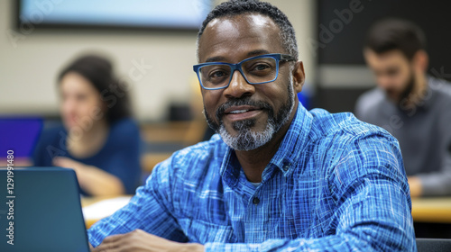 prof, classroom, university, education, teaching, man, adult, smiling, blue, shirt, goggles, learning, student, academic, lecture, technology, laptop, diverse, professional, cognition, interaction, discussion, material, focused, modern, environment, communication, mentor, life events, career, skill, higher, training, research, collaboration, presentation, workspace, engagement, style, dynamic, setting, instructor, sharing, life, development, student, educational
