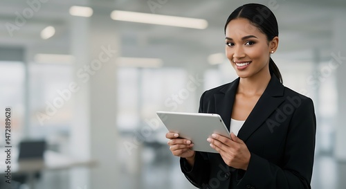Confident woman in a suit smiles, holding a digital tablet in an office, symbolizing professionalism and modern technology.