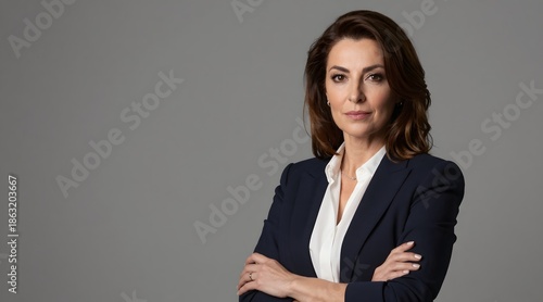 woman, businesswoman, portrait, person, female, adult, professional, confident, brunette, caucasian, studio, isolated, elegant, formal, executive, success, looking, 1, attractive, manager, job, employer, serious, arm, folded, crossed, leader, corporate, occupation, smart, boss, clothing, grey, fashion, hair, blouse, style, pose, jacket, background, white, middle, age, collar, shoulder, suit, indoor