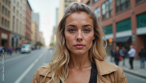 confident, woman, urban, fearless, expression, city, street, daylight, empowerment, blond, adult, serious, portrait, sharpened, clarity, natural, lighting, photo, minimalism, people, crowd, fashion, leather, coat, beauty, female, young, posing, bustling, emotion, city landscape, contemporary, modern, lifestyle, charme, determination, perspective, engagement, high-coloured, sharp, eye-level, 1, sidewalk