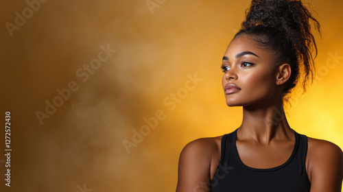 woman, confident, strong, profile, soft light, fitness, athletic, portrait, beauty, black, studio, healthy, active, model, skin, hair, natural, expression, elegance, glow, exercise, determination, inspiration, lifestyle, wellness, empowerment, youth, serene