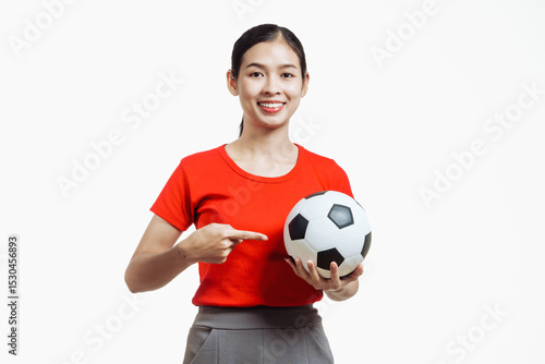 Confident young Asian woman in vibrant red shirt stands against white background, cheering joyfully for her favorite football team, holding soccer ball as enthusiastic football fan, soccer fans.