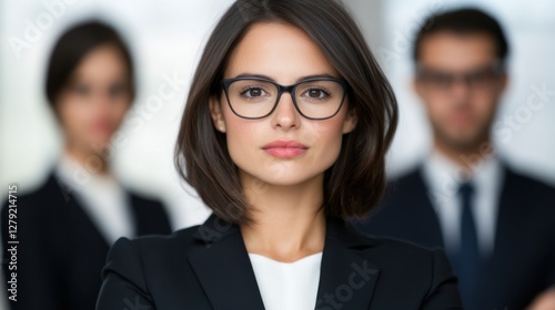 Confident young professional with arms crossed, wearing glasses and a black blazer, standing with colleagues in the background. Soft lighting
