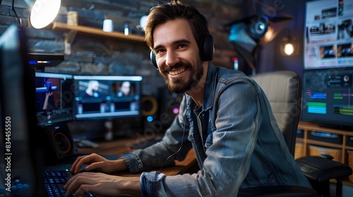 editor, video, work, technology, computer, desk, studio, creative, professional, media, production, filmmaker, businessman, workspace, office, freelance, entrepreneur, equipment, setup, recording, indoor, smiling, portrait, man, adult, caucasian, beard, casual attire, happy, confident, multimedia, audiovisual, content, producer, videographer, cinematography, director, project, workflow
