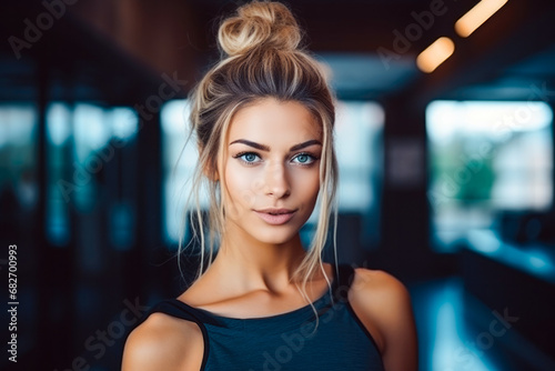 fitness, female, photo, adult, person, woman, face, head, portrait, working out, sport, gym, look, optimistic, body, appearance, character, environment, human being, blond, posing, healthy, young, empty space, copy space, muscle, banner, people, girl, training, lifestyle, background, equipment, physical exercise, wellness, caucasian, slender, free space, motivation, fit, exercising, standing, lady, activewear, athletic, concept, slim