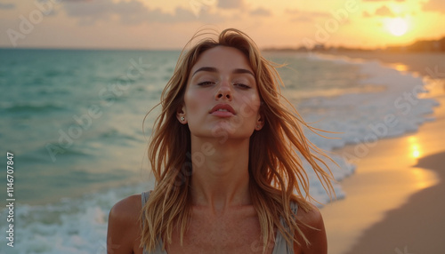 woman, beach, sunset, ocean, confidence, beauty, portrait, wave, sea, serene, nature, summer, hair, freedom, expression, peace, happiness, lifestyle, scenery, warm tones, shoreline, wind, young adult, relaxed, charming, dreamy, emotion, posing, soft focus, landscape, golden hour, calmness, stylish, personal, adventure, feeling, coastal, beachwear, copy space