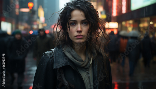 Confident young woman walking in the rain, embracing city nightlife generated by AI