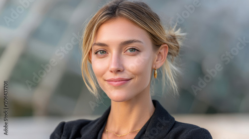 Confident young woman with blonde hair smiles gently showing economic growth and positive energy natural outdoor setting
