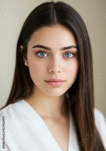 woman, blue, eye, long, hair, confident, young, beauty, portrait, brunette, attractive, fashion, elegant, calm, serene, fresh, modern, stylish, female, professional, natural, purity, softness, face, gaze, feature, expression, minimalism, simplicity, neutral, background, light, make-up, skin, healthy, lifestyle, pristine, poised, sophisticated, charme, graceful, subtile, contemporary, glance, clean, clear, youthful