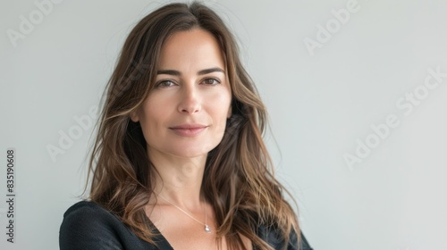 Confident young woman with long brown hair posing with crossed arms against white background in fashion beauty photo shoot
