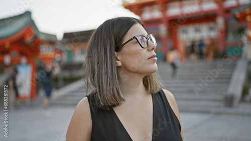 Confidently posing at fushimi inari taisha, a beautiful hispanic woman wearing glasses, smiles broadly, looking around, captivated by the stunning kyoto temple surroundings.