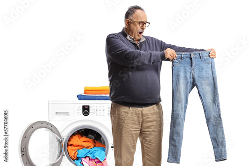 laundry, mature, confused, clothes, 1, adult, appliance, background, chore, clothing, denim, dirty, dry, elderly, emotion, expression, happy, hold, isolated, jean, machine, male, man, 1, pair, pant, people, person, shocked, shrivelled, single, size, small, unhappy, upset, laundered, washer, washing, white, work