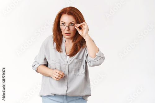 Confused stunned speechless redhead middle-aged woman taking off glasses stare sideways astonished puzzled cannot understand what going on strange things happen standing perplexed white wall