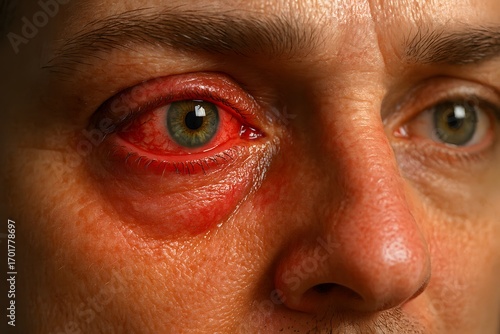 red eye, eyecare, eye doctor, eye protection, eye, closeup, people, skin, model, person, look, expression, face
