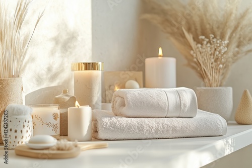 Conjunto de itens de spa com toalhas, velas e elementos decorativos em tons neutros, capturados com luz natural suave, criado com IA generativa.