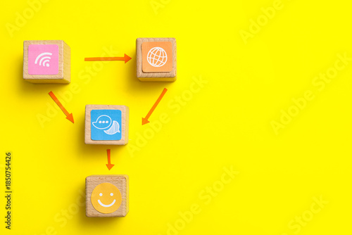 Connected cubes with smile and networking symbols on yellow background. Link concept