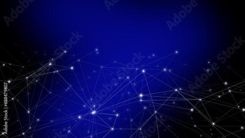 Connected lines on blue dynamic pattern of interconnected white lines and dots creating abstract background with geometric geometry pattern and visual rhythm