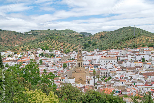 Constantina, one of the most beautiful villages of the North Seville Mountain with the church in the center of the photo, Andalusia, Spain