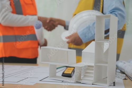 Construction and structure concept of Engineer or architect meeting for project working with partner and engineering tools on model building and blueprint in working site, contract for both companies.