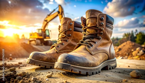 boot, construction, sunset, sun, yellow, machine, earth, dirt, sand, work, safety, brown, leather, ground, tool, equipment, heavy, industrial, site, workplace, protection, job, horizon, sky, cloud, gold, light, nature, detail, closeup, sharpened, depth, image, landscape, powerful, tough, strong, prepared, ready, day, career, labor, hard-wearing