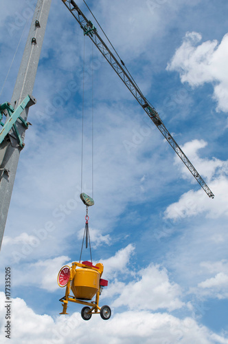 Construction crane lifting cement mixer