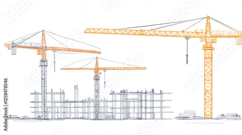 Construction Cranes and Building Frame: Detailed illustration of three tower cranes in varying sizes working on a large building's steel frame.