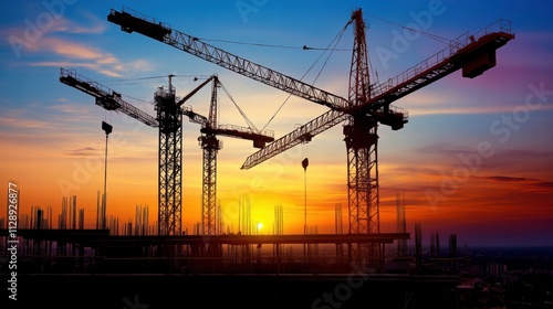 construction, crane, sunset, sunrise, city landscape, city, building, industry, construction site, silhouette, orange sky, evening, dusk, twilight, sky, cloud, urban, development, progress, building construction, heavy machinery, industrial, work, project, architecture, infrastructure, modern, steel, metal