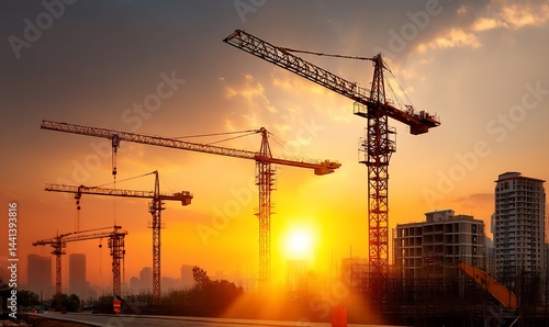 Construction cranes at sunset over city skyline; showcasing urban development; possible use in architectural or construction publications