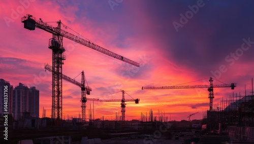 Construction Cranes at Sunset, Silhouetted Against Vibrant Sky