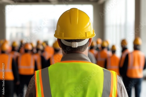 construction, teamwork, safety, hard hat, vest, men at work, crew, building, development, infrastructure, project, engineering, architecture, labor, industry, workplace, occupation, business, progress, urban, city landscape, yellow, orange, neon, bright, group, people, interior, exterior, structure, foundation, framework, concrete, steel, modern, commercial, site, task, collaboration, partnership, safety-gear, construction site, blue skies, window, view, unfinished, background