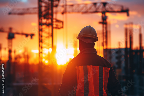 construction, foreman, silhouette, sunset, site, crane, industry, man, project, skyline, dusk, engineering, leadership, men at work, professional, reflective, vest, helmet, safety, management, planning, development, urban, evening, glow, supervision, workwear, infrastructure, city landscape, progress, occupational, horizon, copy space