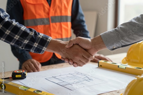 construction, handshake, blueprint, planning, meeting, team, collaboration, site, safety, gear, professional, architectural, plan, building, project, contract, negotiation, detail, timeline, coordination, trade, alignment, risk, management, budget, drawing, review, approval
