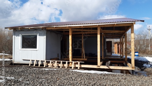 Construction of a modern wooden cabin in a rural area during early spring