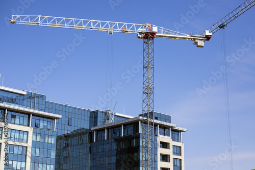 Construction of the building with a tower crane. Construction site, tower crane, building with glass finish, blue sky background.