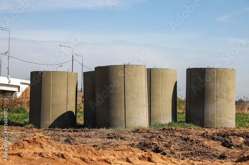 Construction. Pile of concrete slabs and rings in anticipation of building a house. Storage parts of sewerage system on open air