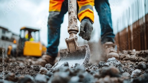 Construction Site Activity with Heavy Machinery and Worker in Action on a Cloudy Day