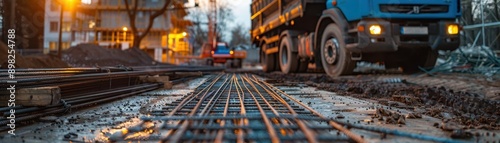 construction, site, dusk, steel, rebar, building, foundation, industrial, urban, development, machinery, equipment, work, progress, architecture, engineering, infrastructure, evening, city, labor, material, preparation, groundwork, project, industry