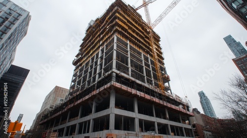 construction, skyscraper, building, city, urban, concrete, steel, crane, development, architecture, structure, highrise, modern, progress, growth, urbanisation, city landscape, tower, frame, foundation, glasses, window, beam, scaffolding, work, site, labor, contractor, engineer, design, industry, metropolis, sky, cloud, facades, elevator, roof, floor, exterior, view, perspective, upward, angle, overhead, industrial, technology, safety, security, machinery