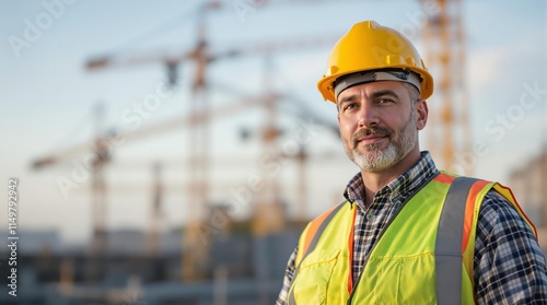 Construction Site Portrait: A confident construction worker looks directly at the camera, radiating experience and competence, with a backdrop of towering cranes in a bustling construction site.