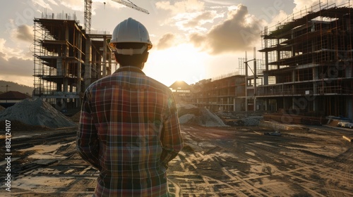 Construction Site Supervisor Overlooking Project at Sunrise