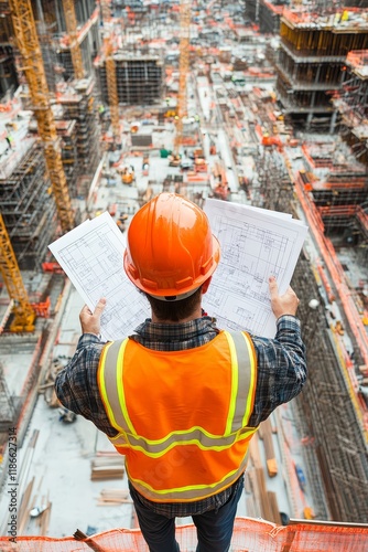 Construction Site Supervisor Reviewing Blueprints, High Above the Busy Construction Site.