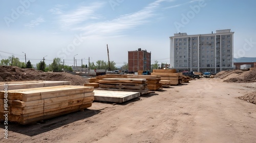 construction, site, timbering, building, material, urban, build, project, development, wood, plank, beam, stack, pile, dirt, earth, ground, industrial, work, progress, foundation, structure, engineering, heavy, equipment, crane, tool, renovation, real, estate, building, excavation, logistic, supply, industry, trade, labor, enterprise, commercial, residential, sky, blue, cloud, daylight, sunny, weather, natural, landscape