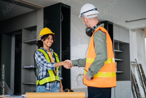 Construction team shake hands greeting start new project plan behind yellow helmet in office center to consults about their building project..