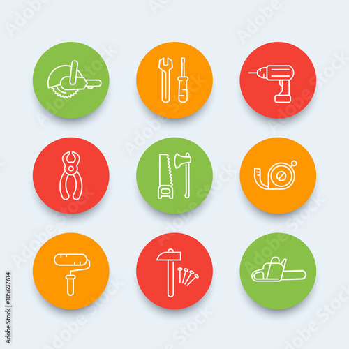 construction tools line icons, construction tools symbols, color round icons, vector illustration